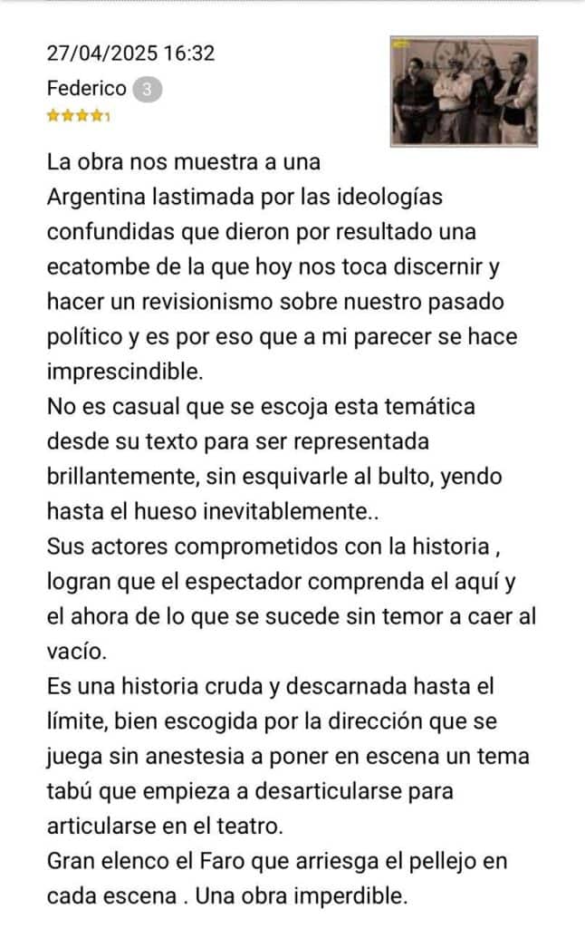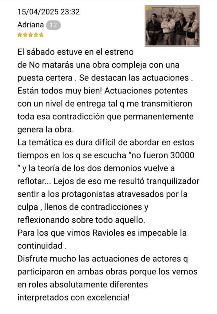 En tiempos donde la memoria parece volverse difusa y los discursos se polarizan con facilidad, “NO MATARÁS (del otro lado)” irrumpe en la escena teatral como un acto de coraje artístico, una pieza que no sólo interpela al espectador, sino que también lo sacude desde las entrañas.